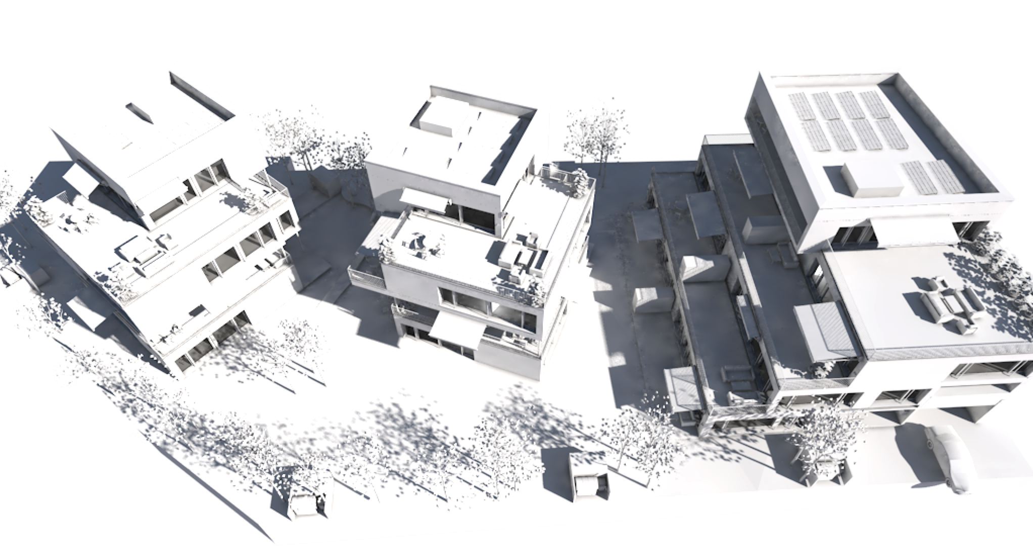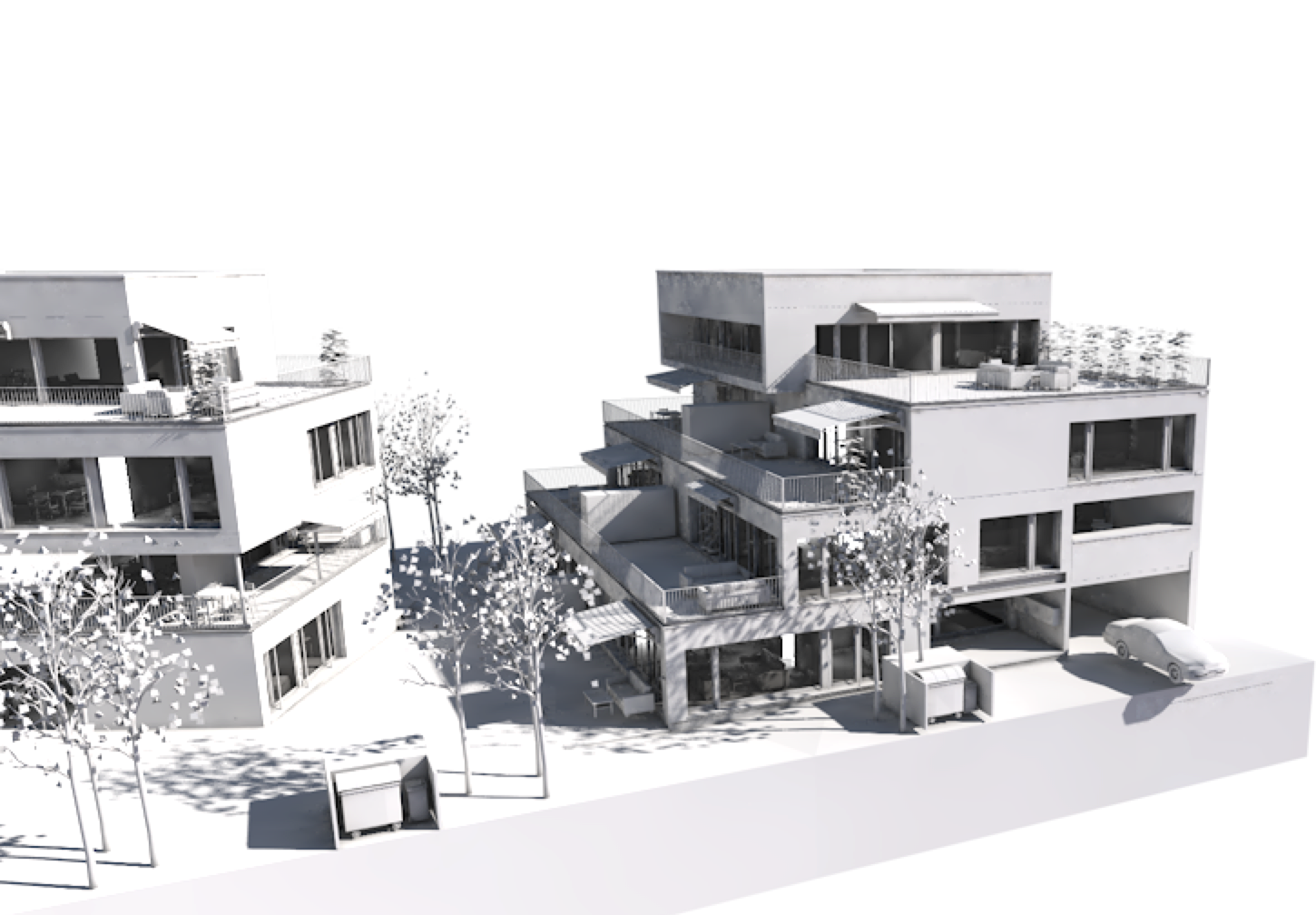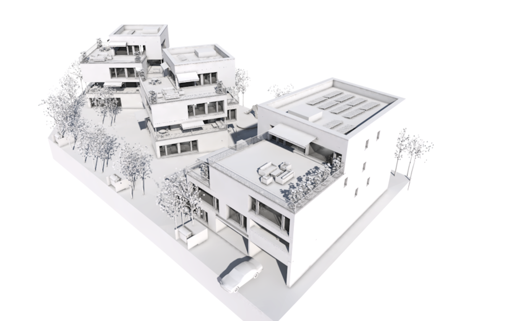 Die Planung dieser Überbauung ermöglicht Terrassen und Balkone mit Privatsphäre für alle Wohnungen.